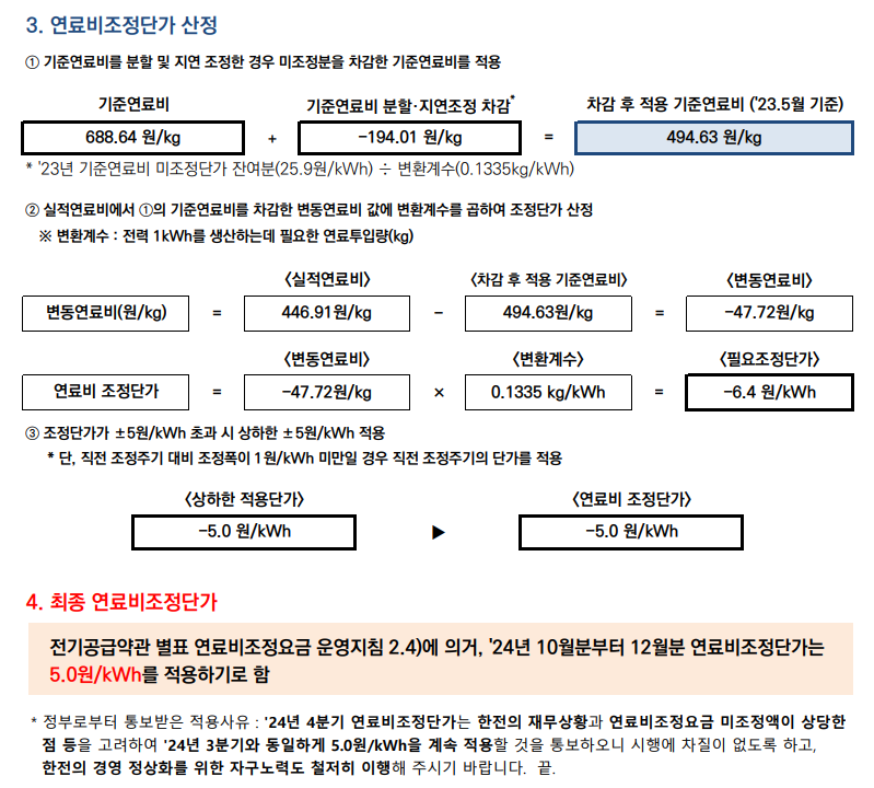 4분기 연료비조정요금은 연료 가격 하락에 따라 kWh당 -6.4원으로 산정됐으나, 한전의 누적적자와 부채 상황 등을 감안해 +5원 상한액을 유지하기로 했다.