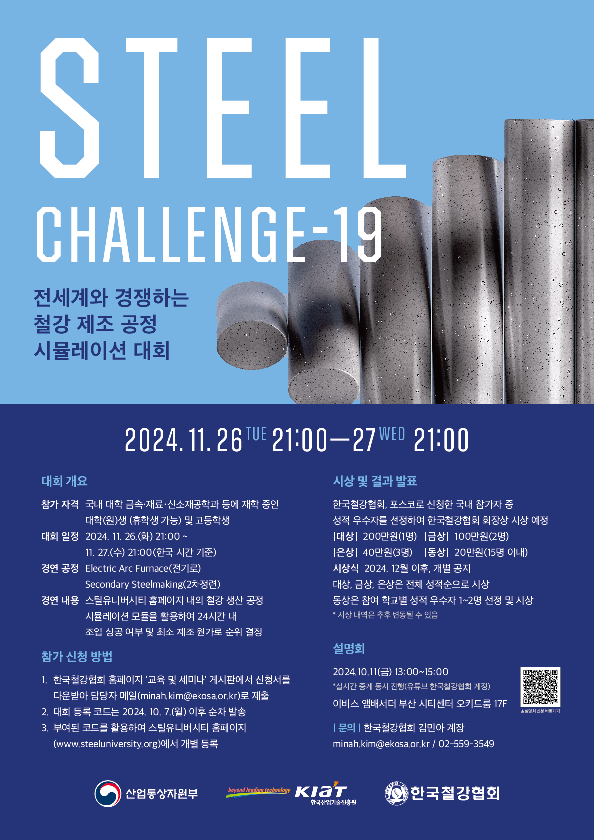올해로 19회를 맞이하는 스틸챌린지 대회는 한국시간으로 11월 26일 오후 9시부터 27일 오후 9시까지 24시간 동안 진행될 계획이다. 올해 경연 종목은 지난해와 동일한 ‘전기로(Electric Arc Furnace)’와 ‘2차 정련(Secondary Steelmaking)’이다.