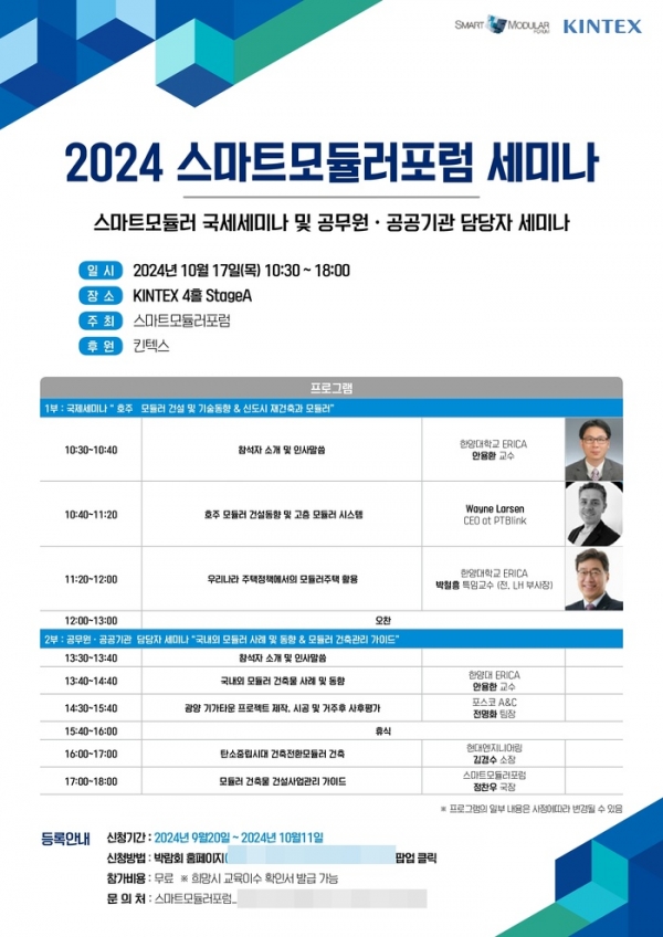 ‘호주 모듈러 건설 및 기술동향&신도시 재건축과 모듈러‘ 프로그램을 비롯해 공무원ㆍ공공기관 담당자를 위한 세미나 프로그램 등도 준비돼 있다.