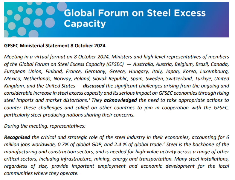 이번 회의는 GFSEC의 7번째 장관급 회의로, 철강 과잉설비 문제가 심화되는 가운데보다 적극적인 조치가 필요하다는 공감 하에 추진됐다.