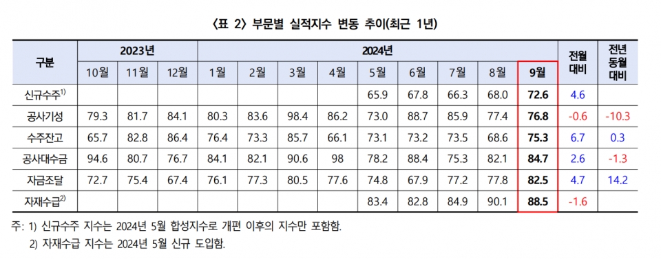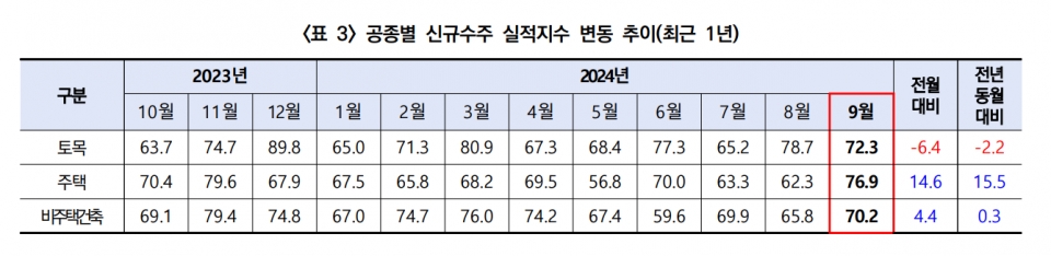 부문별 지수를 살펴보면 9월 신규수주는 72.6으로 전월 대비 4.6p 오르면서 처음으로 70선대로 상승했다. 공종별 신규수주 지수는 토목(72.3)이 전월 대비 6.4p 하락한 반면 비주택건축(70.2)은 4.4p 상승했으며, 특히 주택(76.9)이 14.6p 급등하며 전체 지수 상승을 견인했다.