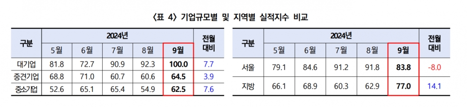 특히 기업 규모별로 대기업 지수는 7.7p 오른 100을 기록했는데, 이는 건설경기가 전월 대비 개선됐다고 응답한 기업과 악화됐다고 응답한 기업 수가 동일했음을 의미한다. 중견기업(64.5)과 중소기업(62.5) 역시 각각 3.9p, 7.6p 올랐으나, 대기업 대비 여전히 낮은 수준을 지속했다.