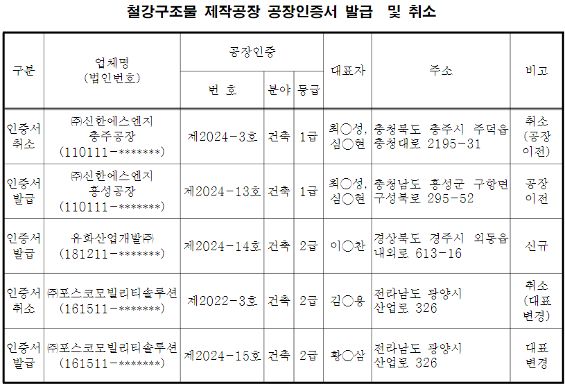 14일, 국토교통부는 지난 2022년 포스코모빌리티솔루션 광양 1공장(광양시 산업로 326)에 발급한 철강구조물 제작공장 공장인증서를 ‘대표 변경’에 따라 취소했다고 고시했다. 같은 날, 이를 대신하여 포스코모빌리티솔루션은 황규삼 대표 명으로 2급 인증서를 신규 발급 받았다.