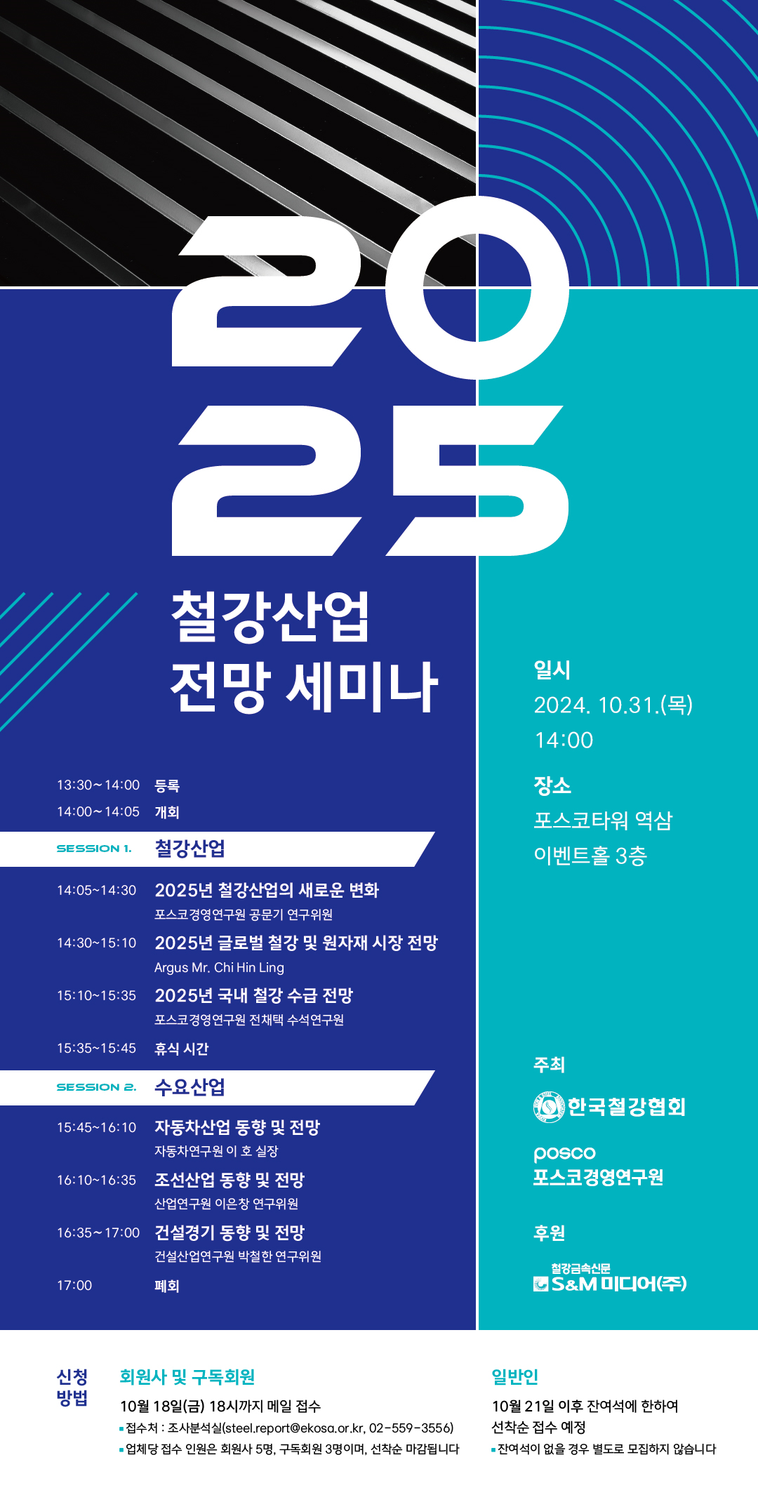 한국철강협회는 “우리 협회는 급변하는 국내외 철강 시장과 수요산업을 분석, 전망을 제시하여 철강업계의 경쟁력 강화를 지원하고자 포스코경영연구원과 공동으로 2025 철강산업 전망 세미나를 개최하오니 많은 관심과 참여 부탁드린다”라고 밝혔다.