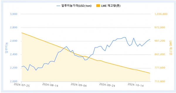 지난 24일 런던금속거래소(LME) 알루미늄 현물 오피셜 가격은 톤당 2,643달러, 3개월물은 톤당 2,677달러를 기록했다.