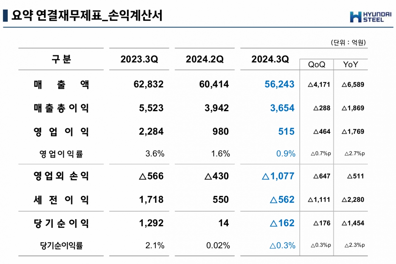 관련기사 (현대제철 IR) 주요 경영 현황 (현대제철 IR) 2024년 3분기 경영실적 연결/별도 [컨콜] 현대제철, 3분기 IR…"美 조지아SSC 가동· 자회사 매각설 사실 무근" 용접 기술 휩쓴 현대제철, '2024 용접의 날' 2관왕 영예 현대제철, 학생 인성 교육 영상 제작 지원