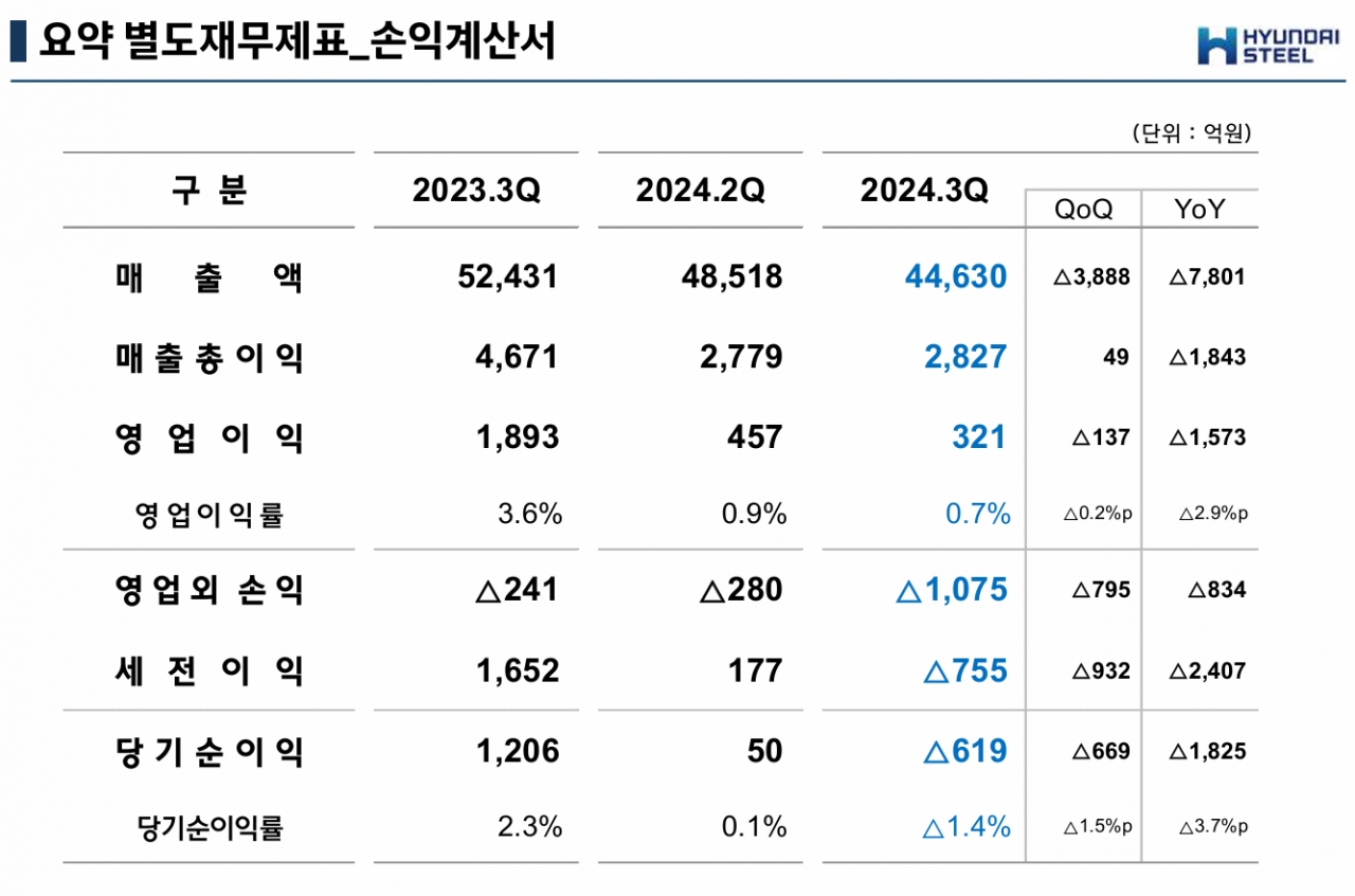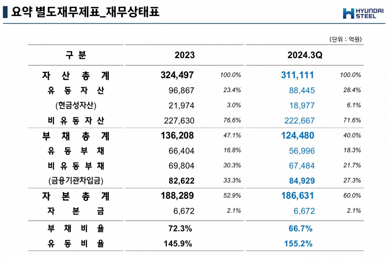 손익계산서//재무상태표 키워드 #현대제철 #2024년 3분기 #재무제표 #손익계산서 #재무상태표 #연결 #별도 윤철주 기자 cjyoon@snmnews.com 다른 기사 보기 관련기사 (현대제철 IR) 주요 경영 현황 (현대제철 IR) 2024년 3분기 경영실적 연결/별도 [컨콜] 현대제철, 3분기 IR…"美 조지아SSC 가동· 자회사 매각설 사실 무근" 용접 기술 휩쓴 현대제철, '2024 용접의 날' 2관왕 영예 현대제철, 학생 인성 교육 영상 제작 지원 저작권자 © 철강금속신문 무단전재 및 재배포 금지