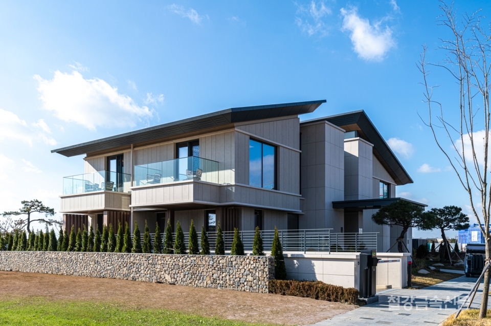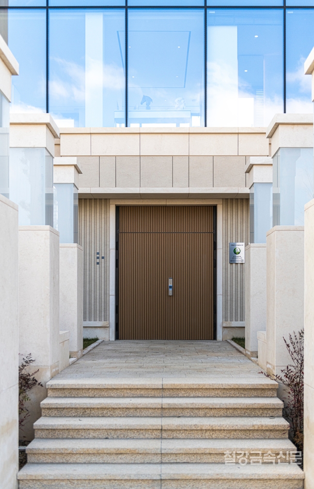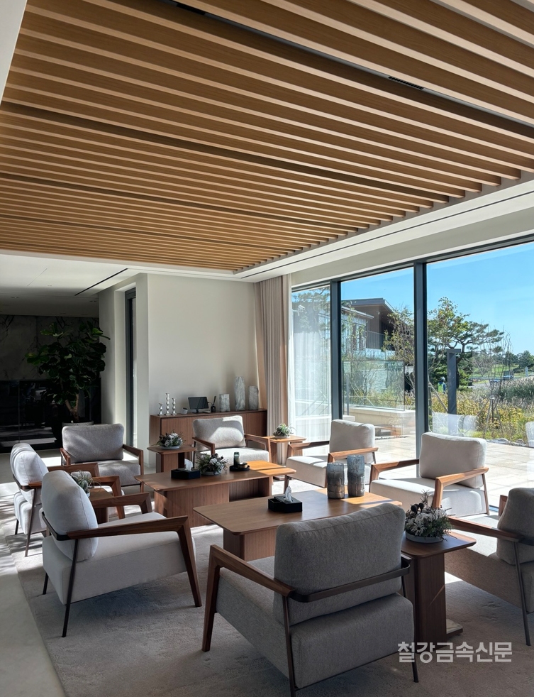 오랜 시간이 지나도 흠집 하나 나지 않는다는 포스코스틸리온의 컬러강판. 인피넬리 컬러강판은 열기와 냉기, 수분, 오염, 스크래치에 강하다. 부식에 강한 포스코의 포스맥(PosMAC)제품 위에 내후성이 가장 우수하다는 불소 도료를 사용해 프린팅하는 최신 기술로 생산한다. 바다를 매립해 조성한 골프장에 위치한 만큼 해무(ocean fog)와 같은 염분 입자가 발생하기 쉬운 조건에서도 질감과 색상이 안정적으로 유지될 만큼 내구성이 뛰어나다.