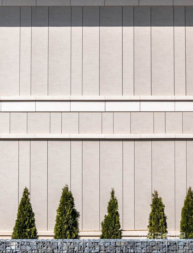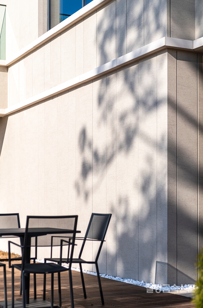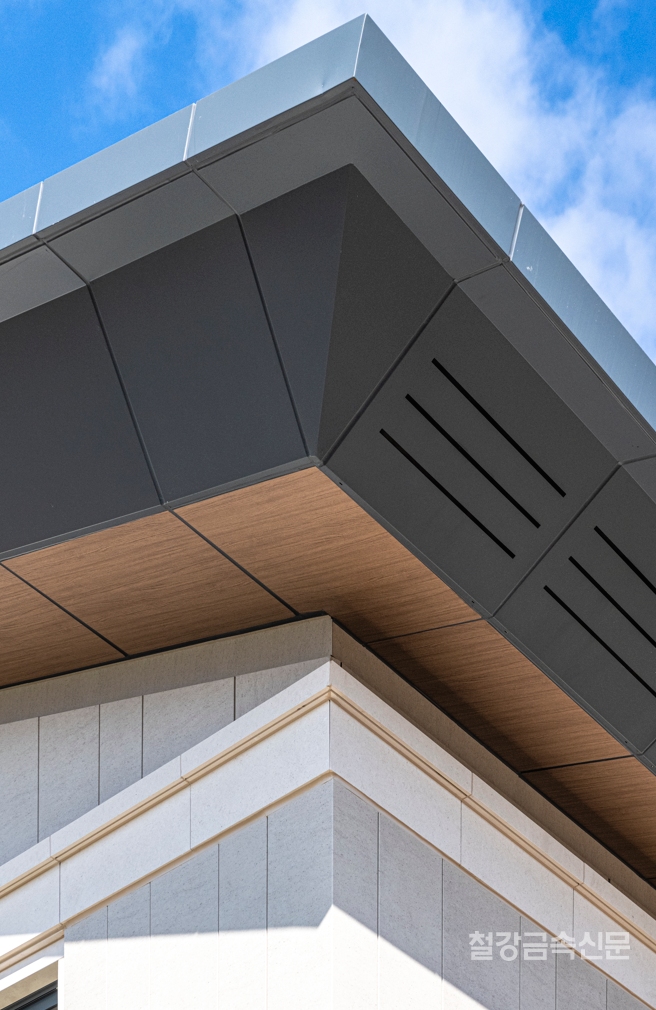 외벽을 스톤 패턴이 있는 프린트 강판으로 마감한 덕분이다. 벽면 전체를 두르고 있는 스톤 프린트 강판은 세로 줄눈으로 일직선으로 이어 붙여 공간이 확장되는 듯한 역동성을 느끼게 하며 더불어 지붕부의 회색 단색 컬러와 목재 패턴 프린트 강판과도 전체적인 톤과 통일감을 준다.