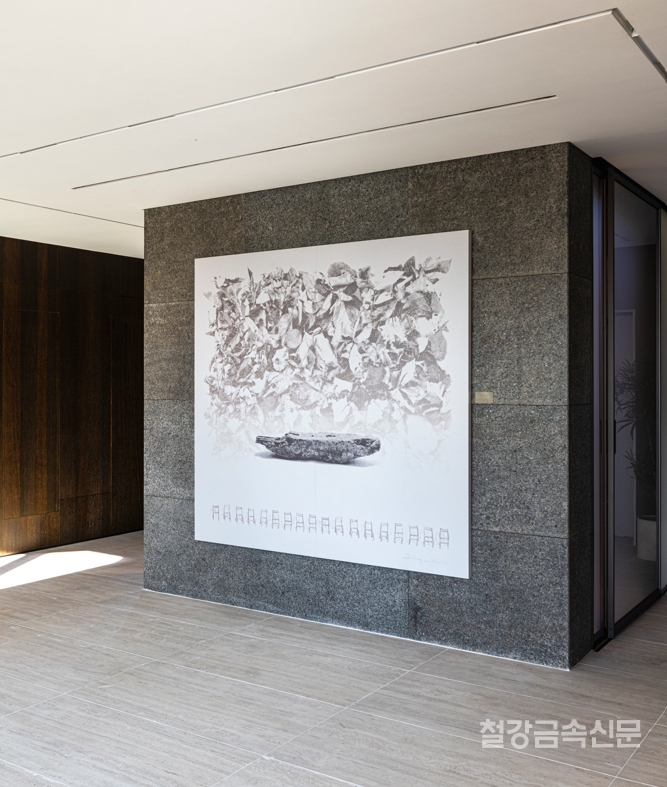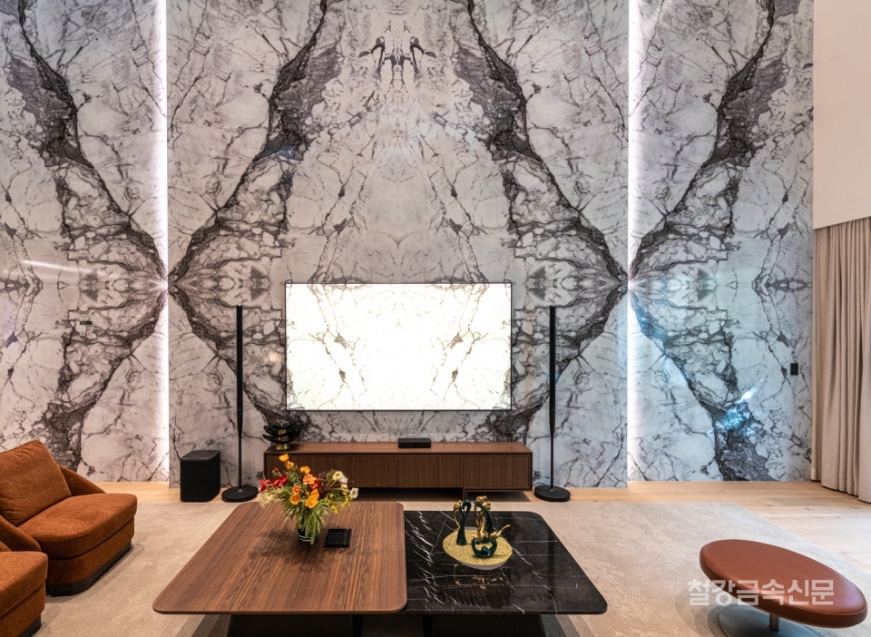포스코스틸리온은 포스아트(PosART) 기술 중 정밀 촬영을 통해 7x8m 사이즈로 패턴화했다. 고급 펜트하우스에 적용된 이태리 석재를 그대로 옮겨오는 등 기술적 시도도 있었다. 실제 대리석 사이즈는 2.7m였음에도 북매치(데칼코마니)와 확대 기술을 통해 아트월로도 무한 확장이 가능하게했다.