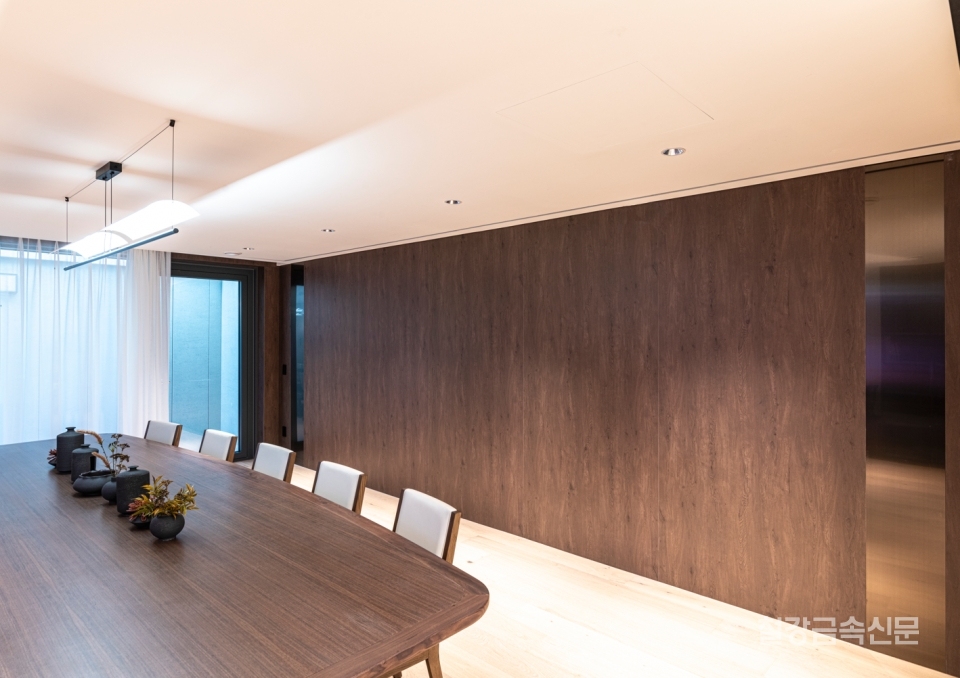 포스코스틸리온은 프린트 강판 기술로 마호가니를 철판용 메란티(meranti)로 재현해냈다. 아주 단단하고 치밀한 재질, 붉은빛과 적갈색, 윤기까지 특유의 질감과 고급스러움을 강판에 모두 담아냈다. 언제 어디서든 자연을 해치지 않고 가까이할 수 있도록 고민한 결과다. 풍부한 미적 경험이 가능하고, 자원 활용 가능성을 삼은 집은 그 자체로 미래다.