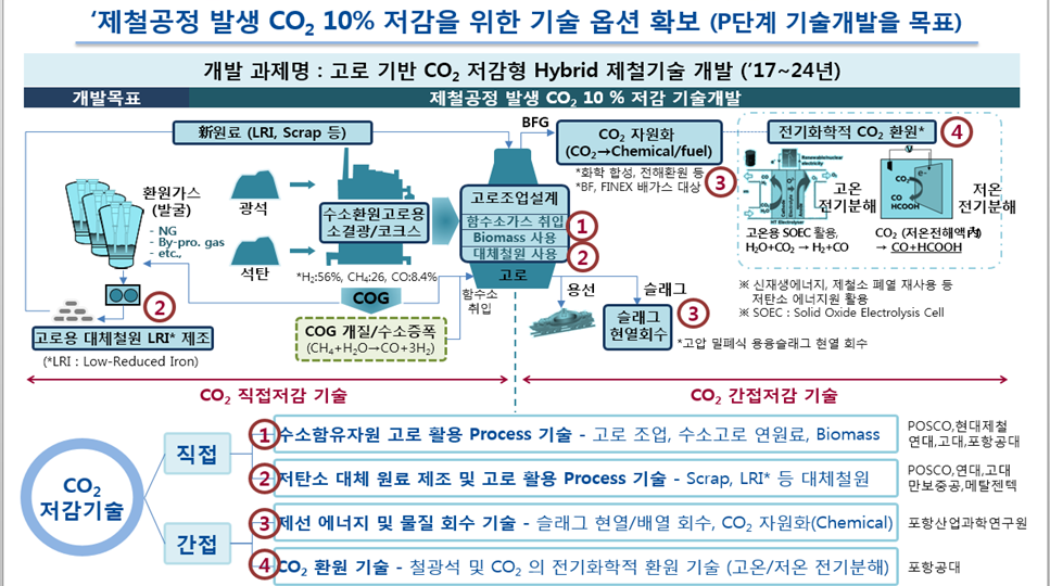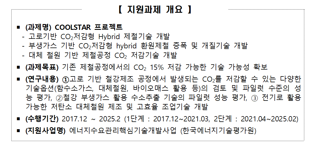COOLSTAR 프로젝트는 고로기반 CO₂ 저감형 하이브리드(Hybrid) 제철기술 개발을 개발하는 것을 목표로 하는 사업으로, 부생가스 기반 CO₂ 저감형 하이브리드 환원제철 증폭 및 개질기술 개발과 대체 철원 기반 제철공정 CO₂ 저감기술 개발도 추진하고 있다.