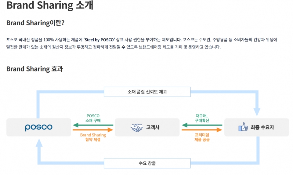 포스코는 2019년부터 수도관, 주방용품 등 소비자들의 건강과 위생에 밀접한 관계가 있는 소재의 원산지 정보가 투명하고 정확하게 소비자들에게 전달될 수 있도록 브랜드쉐어링 제도를 기획해 운영하고 있다.