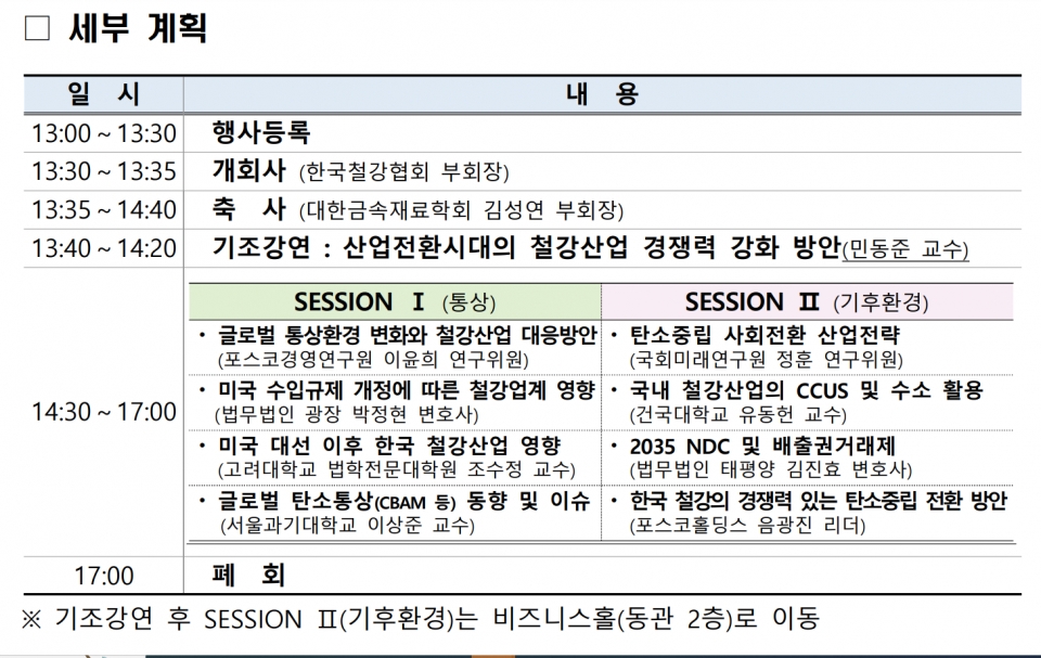 세션2 ‘기후환경’ 부문에선 국회미래연구원의 정훈 연구위원이 ‘탄소중립 사회전환 산업전략’을 제주로 발표하고 뒤이어 건국대학교 유동헌 교수가 ‘국내 철강산업의 CUSS 및 수소 활용’을, 법무법인 태평양의 김진효 변호사가 ‘2035 NDC 및 배출거래제’를, 포스코홀딩스의 음광진 리더가 ‘한국 철강의 경쟁력 있는 탄소중립 전환 방안’을 설명할 계획이다.