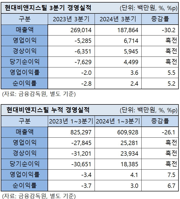 스테인리스 냉연강판 단압밀인 현대비앤지스틸(사장 정일선)이 3분기에도 흑자 전환에 성공하며 수익성 개선에 박차를 가하고 있다. 다만 매출 규모는 일부 감소했다.
