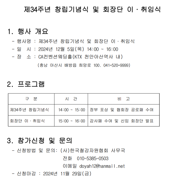한국철강자원협회는 다음달 5일 오후 2시 KTX 천안아산역사 내 CA웨딩컨벤션에서 '제12대 회장단 이취임식'과 '제34주년 창립기념식'을 개최한다고 밝혔다.