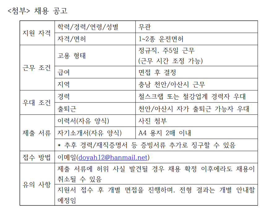 협회 측은 "지원 자격에 특별한 제한은 없으나 철스크랩 및 철강업계 관련 경력자, 천안아산시 자가 출퇴근 가능자가 우대 조건"이라며 "구직 중인 청장년층의 적극적인 관심과 지원을 바란다"고 전했다.