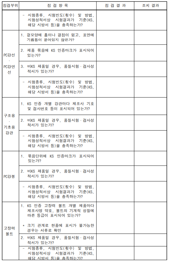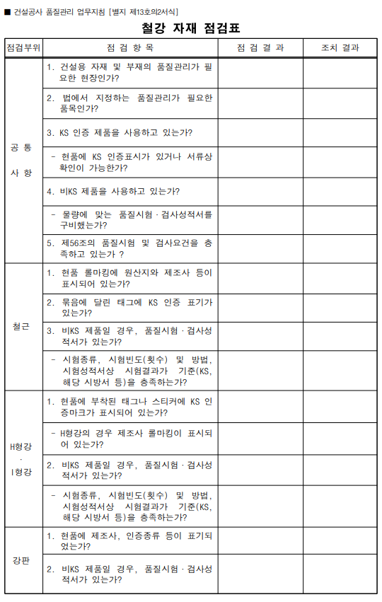 자재 표기와 관련해선 건설공사 품질시험 기준에 『다. 철강구조물공사에 ‘건축 구조용 열간압연형강’』, 『라. 가설기자재에 ‘H형강 말뚝’ 시험 추가』 항목이 추가됐다. 또한 철강 현장에서 이를 통일된 양식대로 작성시키기 위해 철근과 H형강, 강판, PC 강선 등에 대한 KS 인증 또는 KS 인증을 받지 아니한 자재 확인하기 위한 ‘자재 점검표(별지 제13호의2 서식 신설)’가 마련됐다.