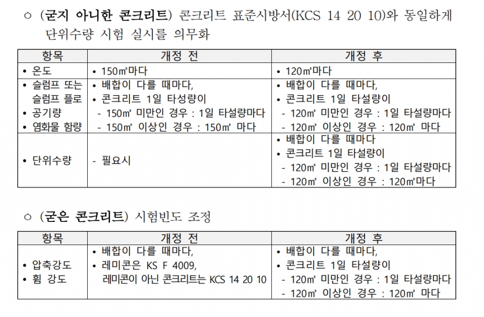 아울러 불량레미콘 예방을 위해 당초 필요 시에만 시험하던 굳지 않은 콘크리트 단위 수량 시험빈도를 120㎥당 1회 이상으로 의무화했다. 굳은 콘크리트의 압축강도와 휨강도 시험도 동일하게 1일 타설량 120㎥당 1회 이상으로 강화해 콘크리트 품질관리 기준을 한층 높였다.