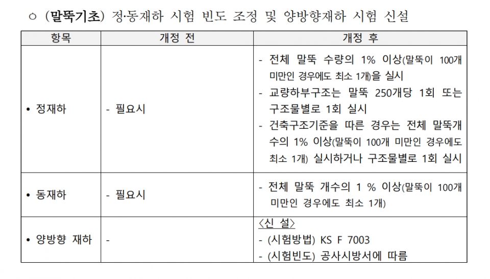 말뚝기초 설계와 시공 시 하중에 대한 안정성과 성능도 더욱 정밀하게 검증하기 위해 '양방향 재하 시험'도 신설했다. 말뚝의 축방향 강도를 평가하기 위해 상부 하중만 가하는 기존 재하 시험과 달리 양방향 재하 시험은 설치된 하중 셀을 사용해 위아래로 하중을 가하는 방식이다. 정·동적 재하 시험 빈도도 전체 말뚝 수량의 1% 이상 시험하도록 규정했다.