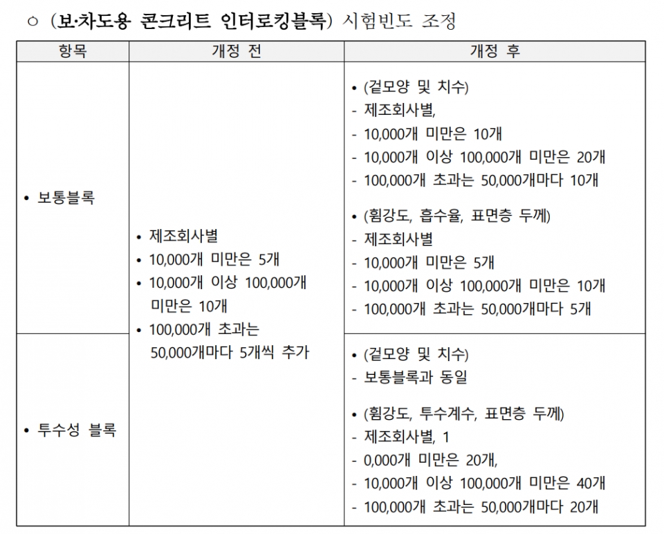 보도(인도)와 차도용 콘크리트 인터로킹 블록의 시험 기준도 당초 보통블록과 투수성블록 모두 동일하게 적용하던 시험빈도를 겉모양 및 치수와 휨강도·투수계수·표면층 두께 등 시험 종목별로 세분화했다.