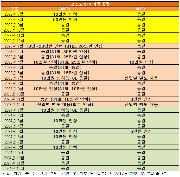 최근  국내·외 STS 시장 분위기는 수요가 위축된 가운데 시중 업체들의 연말 재고 부담을 덜어내기 위한 움직임이 감지되고 있다. 또한 중국의 한국향 내년 초 물량 오퍼 가격이 인부 하락 인하로 알려지며 향후 국내 시장 가격이 추가 하락할 수 있단 우려하는 분위기도 일부 형성되고 있다.