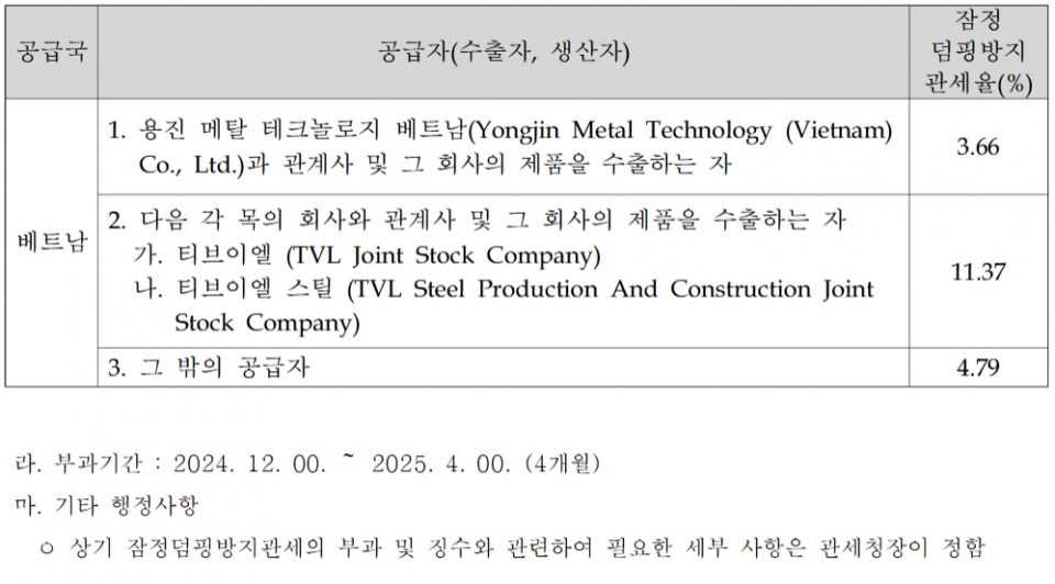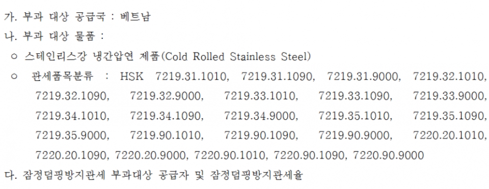 12월 중하순부터 4개월간 베트남산 STS CR에 예비조사 결과 수준 잠정관세 추진