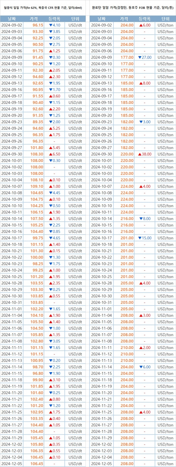 키워드 #철광석 #원료탄 이사무엘 기자 smlee@snmnews.com 다른 기사 보기 관련기사 (주간시장동향-후판) 범인은 누구? (주간시장동향-열연강판) 내년은 더욱 어렵다는데 저작권자 © 철강금속신문 무단전재 및 재배포 금지