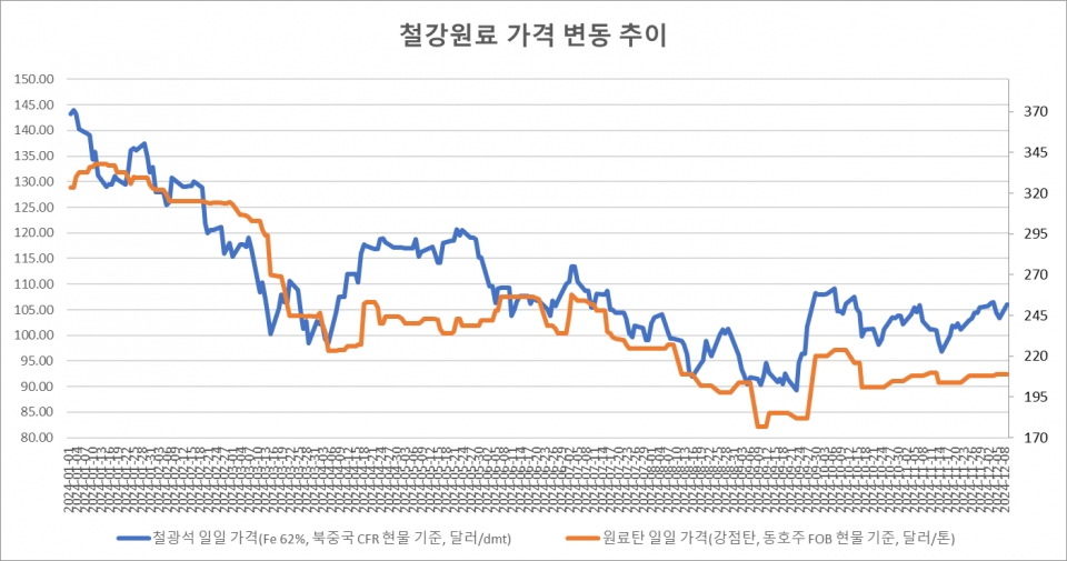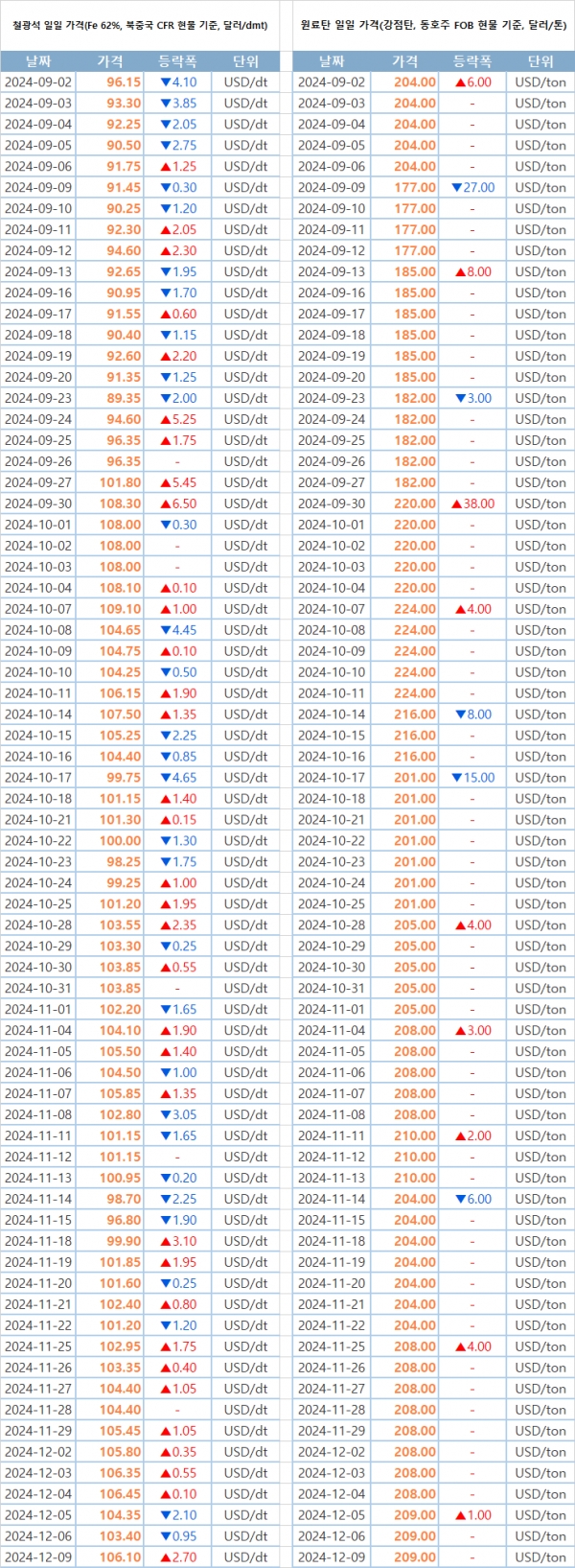 [표] 일일 철강원료 가격 동향(12월 9일)