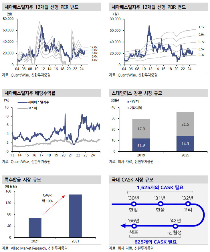 아울러 회사의 미래 먹거리 사업으로 주목되는 ‘사용후핵연료 건식저장용기(CASK)’ 사업에서 유의미한 매출 발생이 본격화될 것으로 예상된다. 세아베스틸지주의 자회사 세아베스틸은 CASK 시장에서 지난 2023년 한수원으로부터 사용후핵연료 운반용기를 수주하며 국내 레퍼런스(참고할 실적)를 확보했고 2042년까지 국내에서만 2,300개 CASK 설치 수요가 발생할 것으로 예상되는 가운데 최소 3분의 1 이상의 물량을 수주하리라 전망된다.