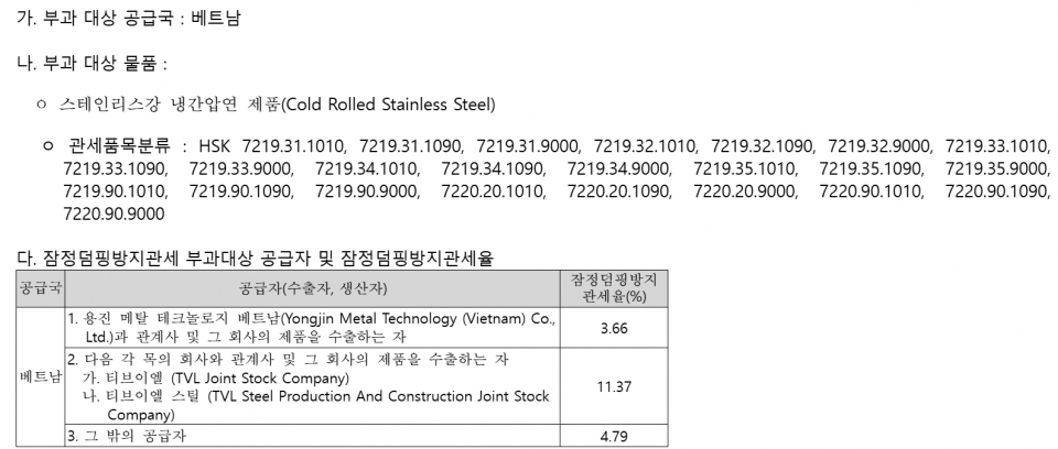 기획재정부가 무역위원회의 베트남산 스테인리스강 냉간압연강판 예비 반덤핑 조사결과를 받아 드려 잠정관세를 부과한다고 밝혔다. 이달 19일부터 내년(2025년) 4월 18일까지 4개월간 3.66%~11.37% 수준의 잠정 관세가 적용된다.