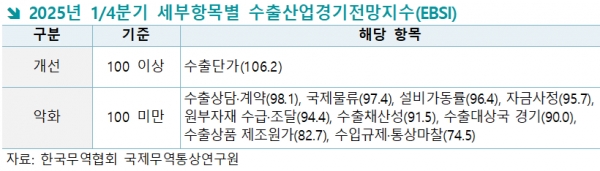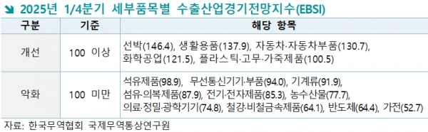 반면, 선박(146.4), 자동차·자동차부품(130.7) 등은 100을 상회하며 전분기에 이어 수출 호조를 이어갈 것으로 조사됐다.