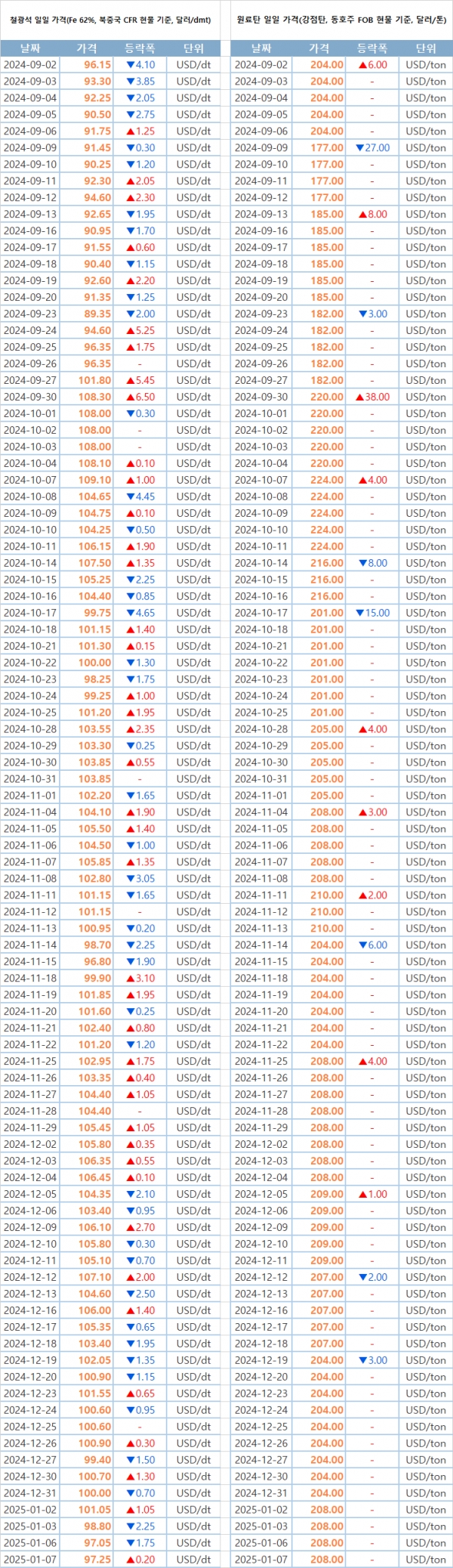 [표] 일일 철강 원료 가격 동향(1월 7일)