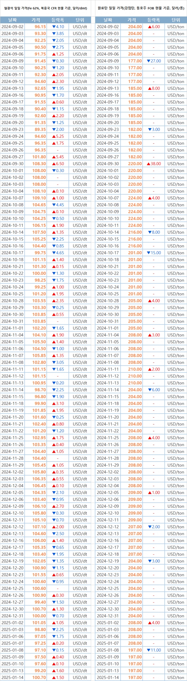 [표] 일일 철강 원료 가격 동향(1월 14일)
