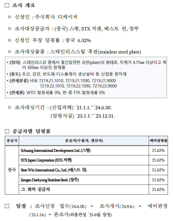 스테인리스 후판이 조선과 강관, 반도체‧디스플레이 생산설비 등 산업용 원자재로 쓰이는 가운데 해당품목의 WTO 협정세율과 한-중 FTA 협정세율은 0% 수준이다. 청원인인 DKC가 반덤핑 요청 수준으로 6.32%를 주장한 가운데 예비 관세율은 이보다 모두 높게 책정됐다. 무역위원회가 국내 산업피해 수준과 현지 업체들의 덤핑 수준을 고려해 높은 예비 세율을 책정한 것으로 알려졌다. 국내산업피해는 2021년 1월 1일부터 지난해 상반기(6월 30일)까지 조사됐고, 반덤핑 사실 여부는 2023년 1월 1일부터 2023년 12월 31일까지를 기한으로 조사됐다.