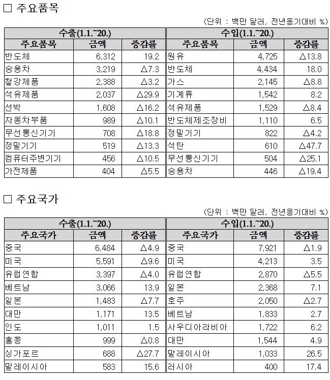21일, 관세청은 1월 1일~20일 기간의 수출입 현황을 발표했다. 이 기간 수출은 316억 달러로 전년 동기 대비 5.1% 감소했고 수입은 354억 달러로 전년 동기 대비 1.7% 감소했다. 무역수지는 38억 달러 적자를 보였다
