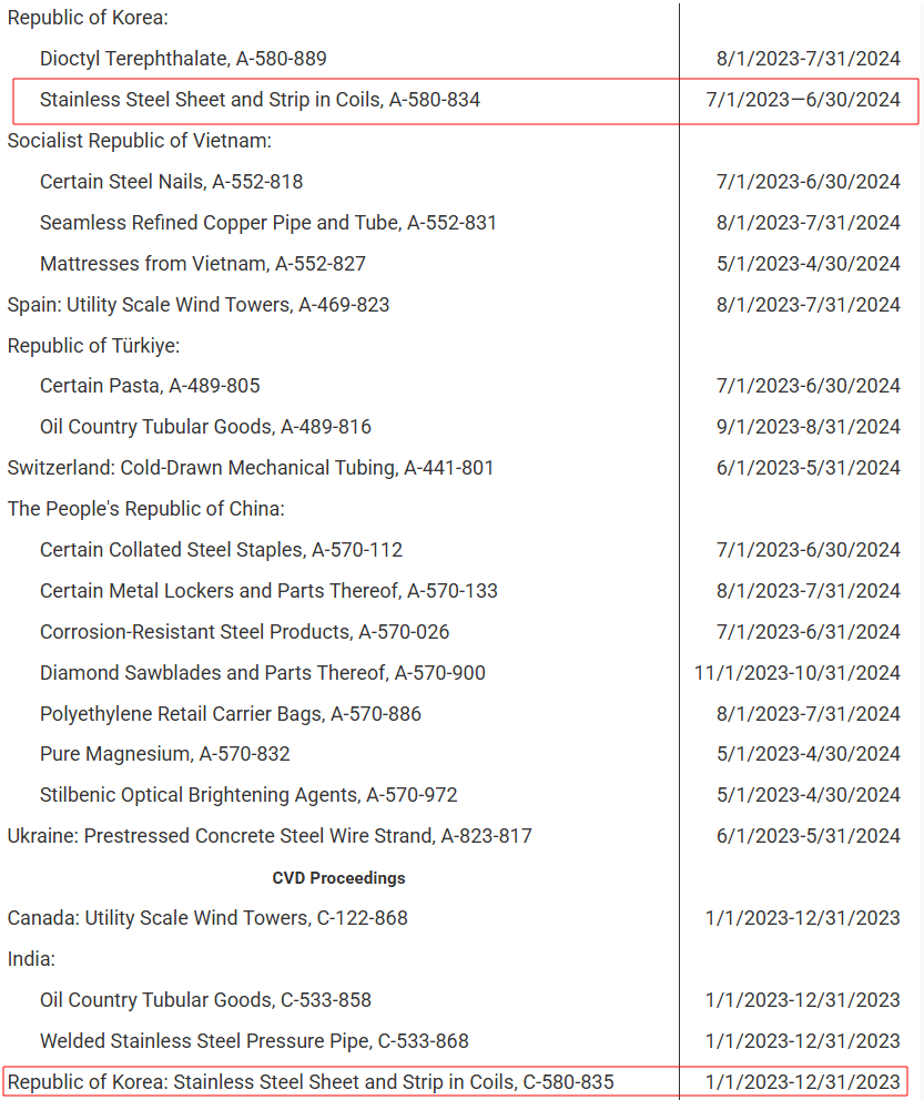 27일, 미국 상무부는 연방관보를 통해 한국산 스테인리스강 코일 및 강판(Stainless Steel Sheet and Strip in Coils)에 연례재심으로 적용 중인 반덤핑·상계관세 행정재심사를 철회한다고 밝혔다.
