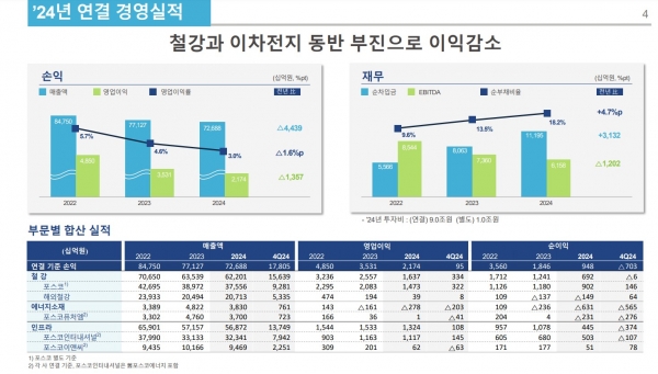 포스코홀딩스는 3일 기업설명회를 통해 지난해 철강과 이차전지 동반 부진에 이익감소로 이어졌다고 밝혔다.
