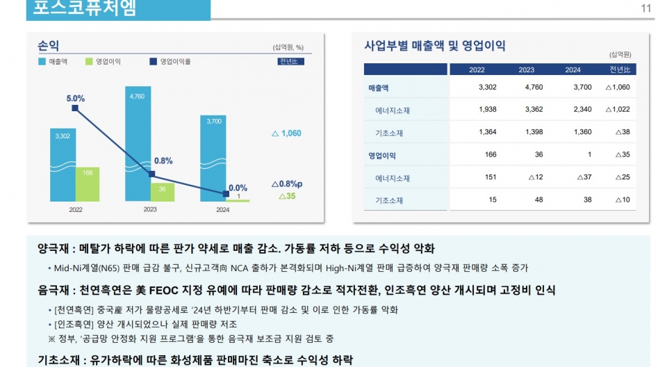 [포스코홀딩스IR] 포스코퓨처엠, 양극재 판매가격 하락 및 음극재 판매 감소로 매출·수익성 감소