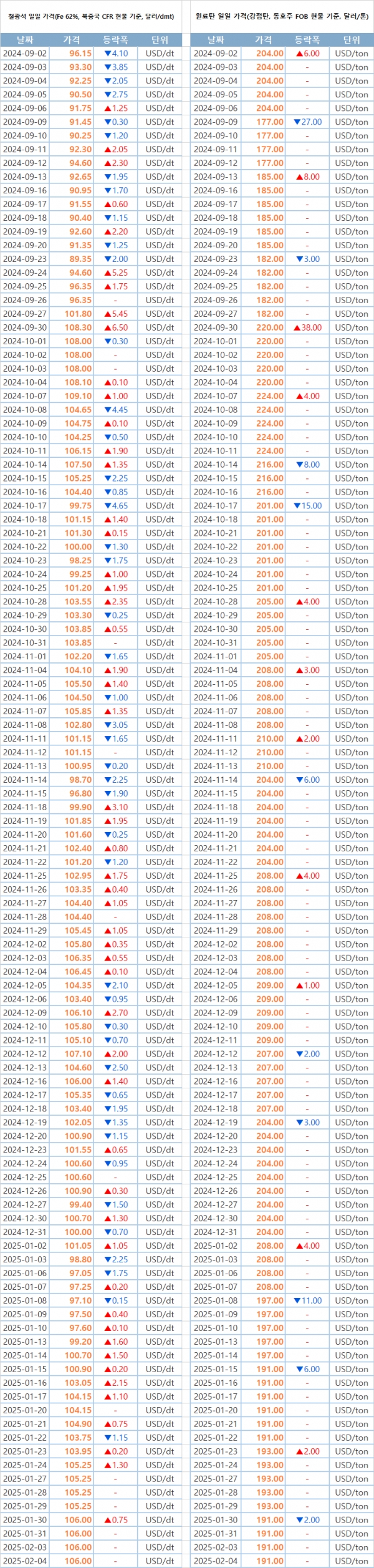 [표] 일일 철강 원료 가격 동향(2월 4일)