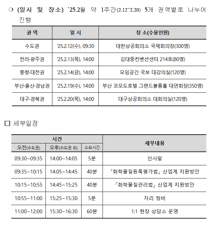지역별로 수도권은 오는 2월 12일 오전 9시 30분 대한상공회의소 지하 2층 국제회의장에서, 전라·광주권은 2월 13일 오후 2시 김대중컨벤션센터 214호에서, 충청·대전권은 오후 2시 대전시 모임공간 국보 대회의실에서, 부산·울산·경남권은 2월 19일 오후 2시 부산 코모도호텔 그랜드볼룸홀 대연회장에서, 대구·경북권은 2월 20일 오후 2시 대구상공회의소 대회의실에서 열린다.