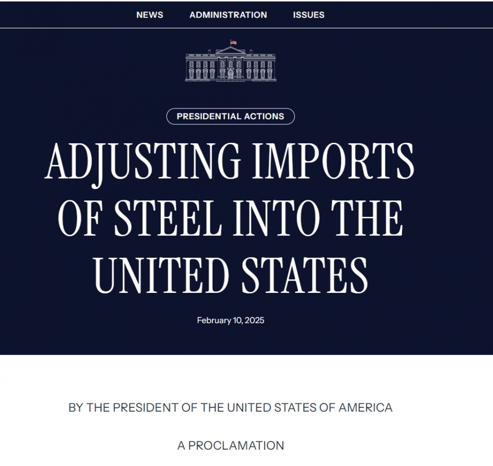 현지시각 10일, 미 백악관은 홈페이지를 통해 대통령 선언문을 공개하며 모든 철강 수입에 25% 보편관세를 부과하고 기존 각 나라와 맺은 철강 관세 합의(쿼터제 포함)를 미국 대통령의 권한으로 무효화한다는 주장을 올렸다.