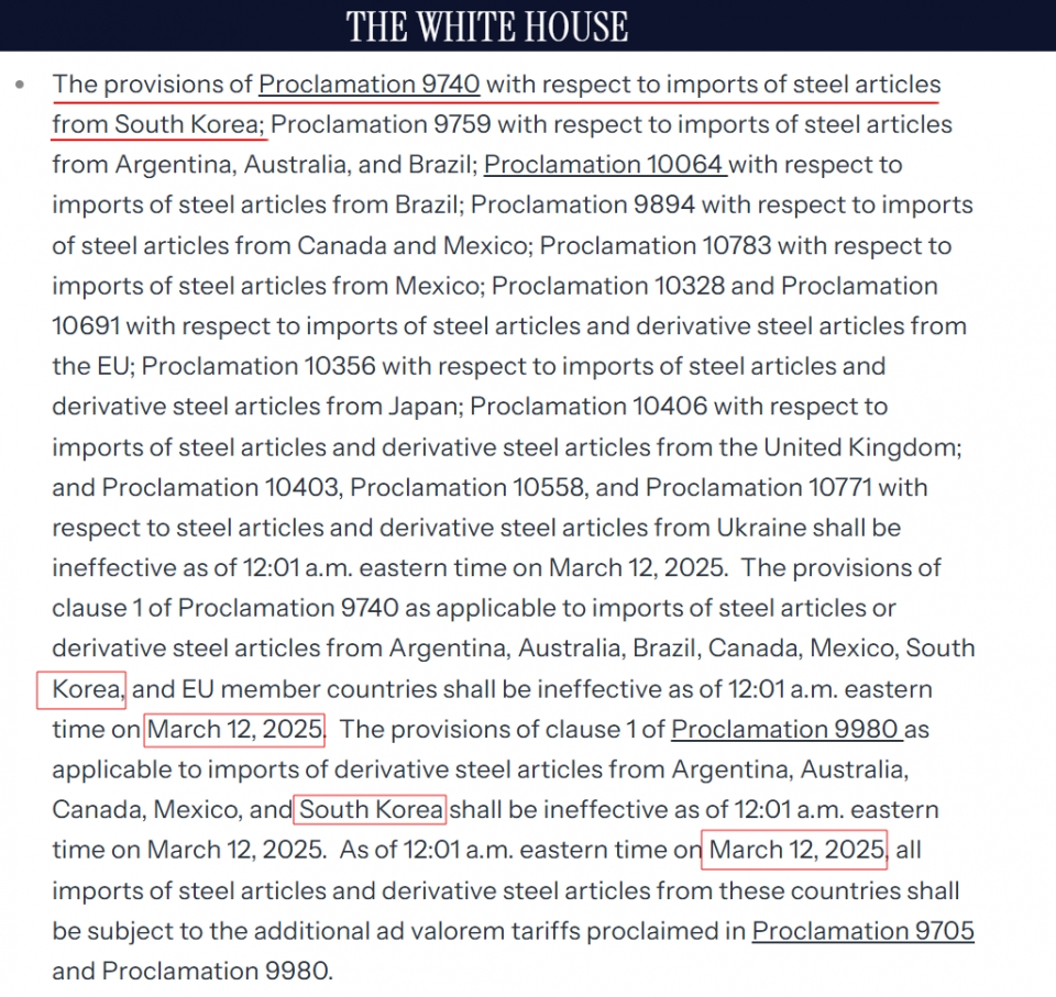 한국 철강 수입과 관련해선 ‘대통령선언문(포고령) 9740’에 담긴 기존 관세 합의 및 쿼터제 내용이 오는 3월 12일 오전 0시 1분부터 무효화한다고 밝혔다. 포고령 9740은 지난 2018년 4월 30일, 트럼프 대통령이 본인의 첫 임기 때 발표한 내용으로 한국의 철강 수출 쿼터제 제안을 받아드려 1기 때 추진한 25% 보편관세에서 한국 등 관세 문제가 합의된 국가에 관세 적용을 예외로 두겠다는 내용을 담았다.