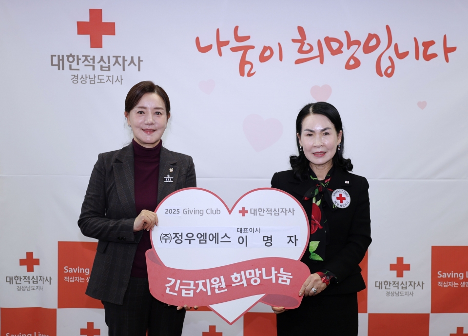 지난 10일, 정우엠에스 이명자 대표는 적십자사 경남지사를 방문하여 2025년 기빙클럽 20호로 가입하며 기부금 전달식 및 대한적십자사 회원유공자 명예장을 수여했다.