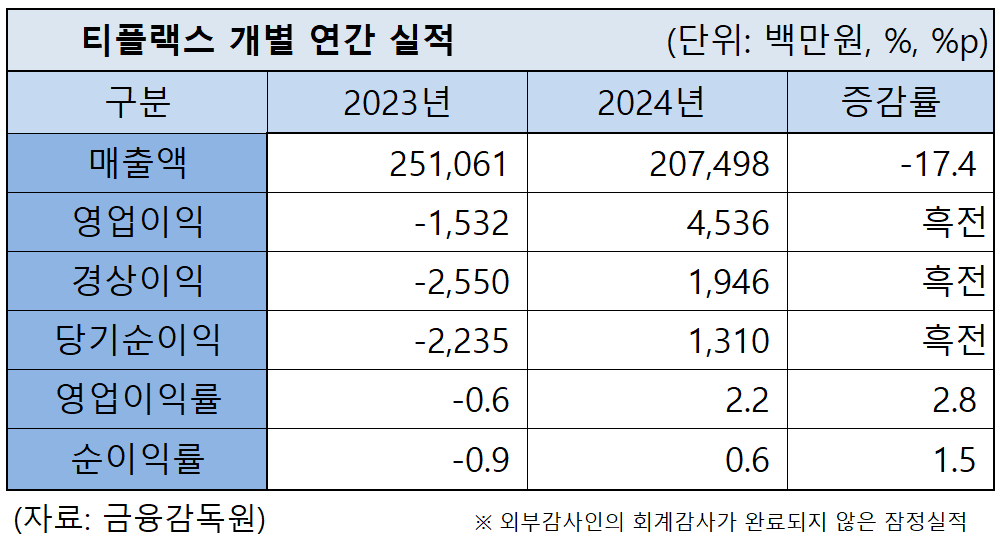 한편, 티플랙스의 지난해 개별 잠정 매출액은 2,074억 9,700만 원으로 전년 대비 17.4% 감소했다.