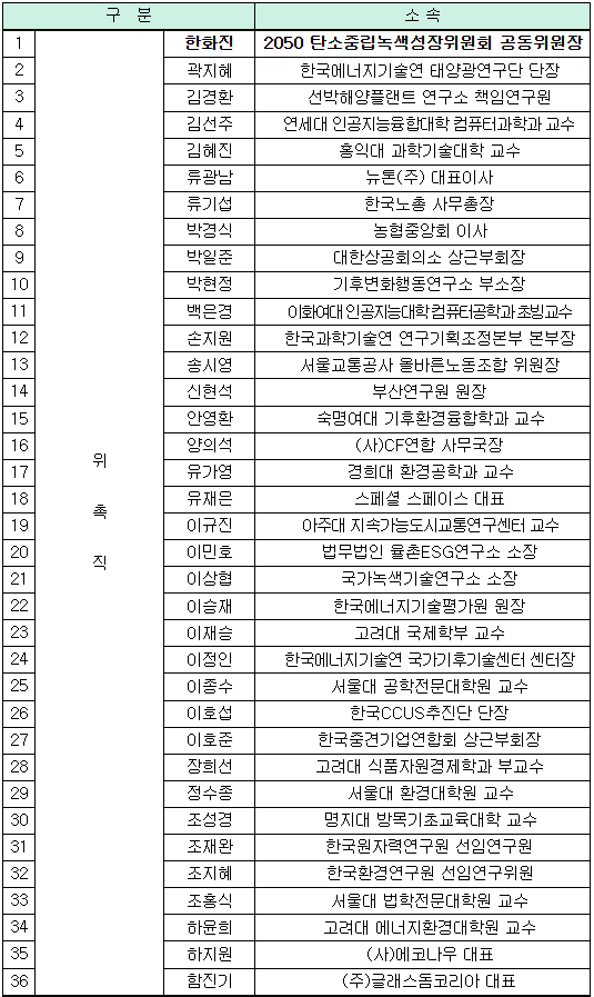 민간에선 한화진 공동위원장 재위촉..여성·청년 등 다양성 강조했지만 산업계·철강업은 소외
