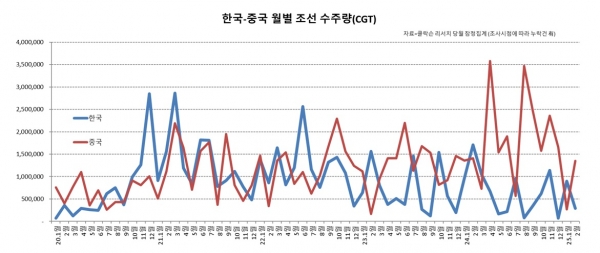 1~2월 글로벌 누계 수주는 384만CGT(123척)로 전년 동기 1,111만CGT(477척) 대비 65% 감소했다. 국내 조선업계의 수주는 122만CGT(21척, 32%)로 전년 대비 65% 감소했으며 중국은 185만CGT(74척, 48%)를 기록해 전년 대비 70% 줄었다.