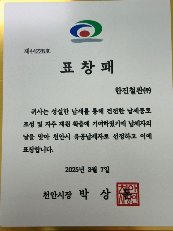 한진철관, ‘2025 천안시 유공납세자 시상식’에서 유공납세자 인증패 수상