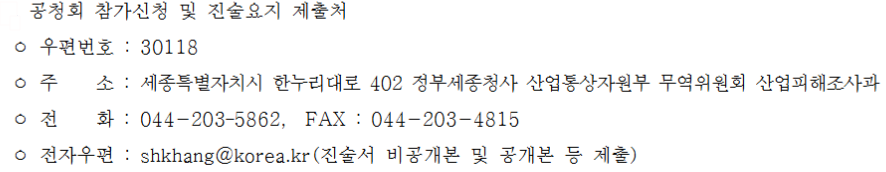 공청회 참가를 희망하는 업계인은 4월 3일까지 이해관계인이라는 소명자료와 진술할 발연요지, 인적사항을 첨부하여 무역위원회에 신청하면 된다. 무역위원회는 이번 공청회의 이해관계자를 국내생산자, 국내수입자, 국내수요자, 외국수출자, 관련단체 대표자, 관련부처 관계자, 수출국 정부 관계자 등으로 한정했다.