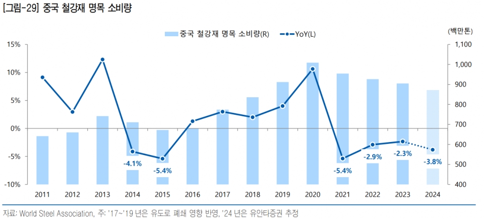 유안타증권 이현수 연구원은 중국의 철강 공급량이 10년 만에 변화가 감지되고 있다고 주장했다. 이 연구원은 “중국 국가발전개발위원회(NDRC)는 올해 주요 업무로 조강 생산량 통제와 철강산업 축소 및 재편 추진을 언급했다”라며 “또한 중국 시진핑 주석은 지난 1월 번시강철을 방문하여 철강 산업 구조 최적화를 촉구한 것으로 알려졌다”고 배경을 설명했다.